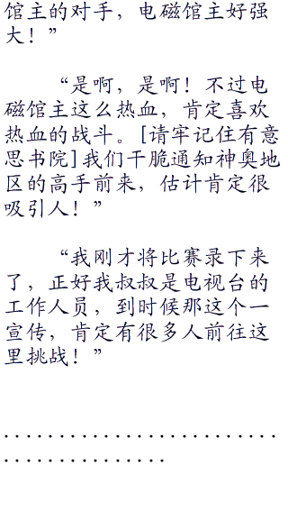 电磁这一次战斗很开心,虽然输的有些郁闷,更是因为战斗将整个道馆给毁了。不过电磁依旧很开心,因为这场战斗真的很激烈。