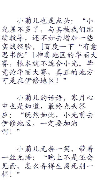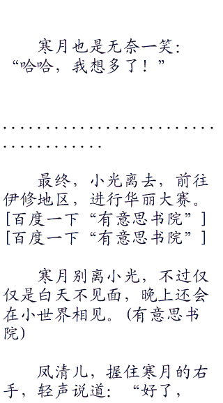 寒月看着眼前的小光,带着丝丝无奈,轻声说道:“小光,真是对不起。一路上,仅仅学到知识。却没有在舞台上尽情的表演!”