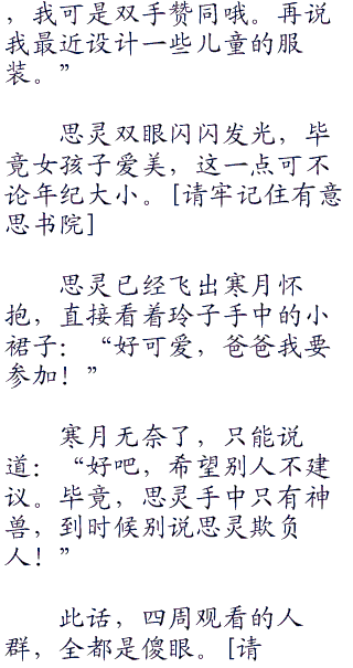 希罗娜直接无语了,思灵在寒月怀中,也是激动的说道:“我也要参加,我也要参加。我要和若风小弟弟一起!”
