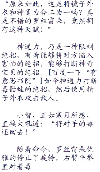 寒月看着罗丝雷朵,淡淡的说道:“草系,毒系神奇宝贝。这是你刚收服没多久的神奇宝贝?”