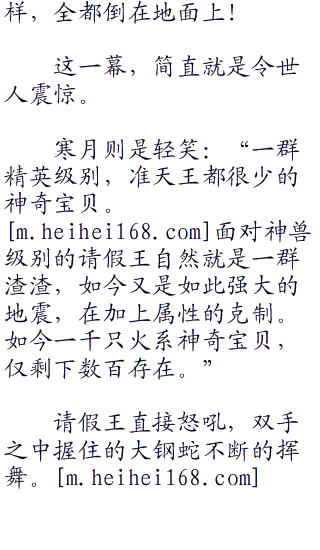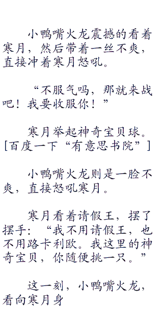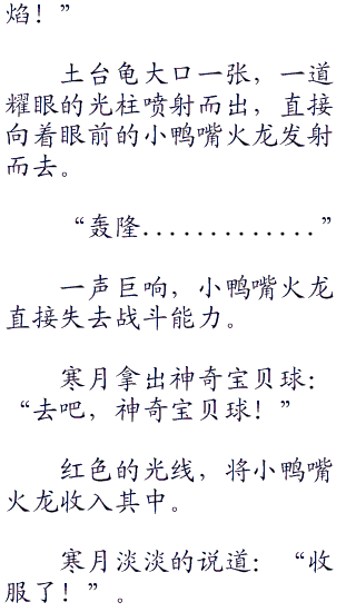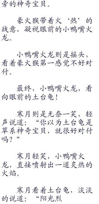 此刻,寒月看向一只神奇宝贝,很是好奇的说道:“小鸭嘴火龙,真是一个奇迹!没想到,统领一千多只火系神奇宝贝的首领,竟然是一只小鸭嘴火龙。”