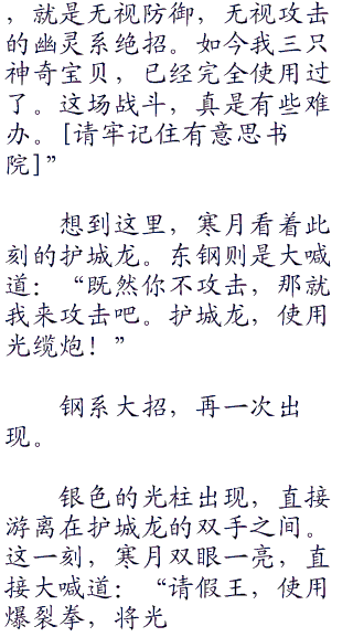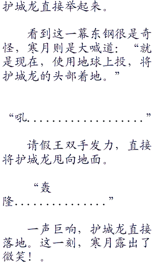 我才知道,水的防御力也是强大无比。为此我来到水脉市,靠着水脉市的海水,不断的训练护城龙。护城龙虽然是岩石系,但是却克制对于水的恐惧,在海水的冲击下,不断的锻炼自己的身躯。最终护城龙出现一次脱皮,脱皮之后护城