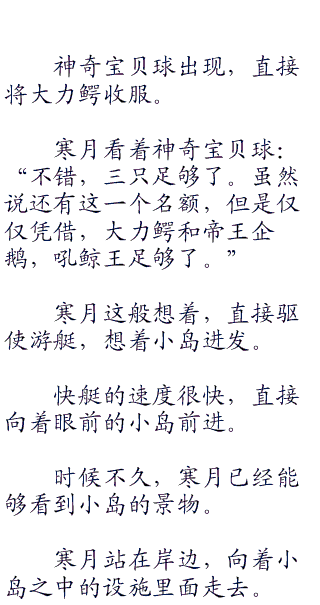 海岛是一个游乐设施,乔伊则是拿起话筒:“好了,第二轮比赛就要开始了。请各位参赛者,在三个小时之内,收服自己满意的三只神奇宝贝,然后回到这个小岛上。记住,时间是三个小时。另外,只能收服大海之上的神奇宝贝!”