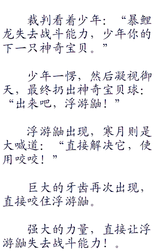 “暴鲤龙,你就战斗一下。你看对面的神奇宝贝,就是一只美纳斯,很容易就战胜了。”