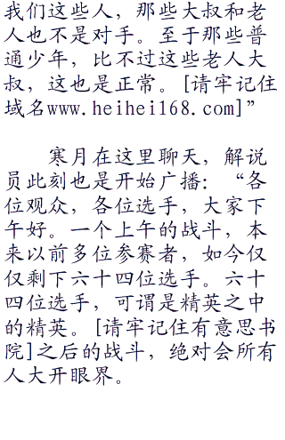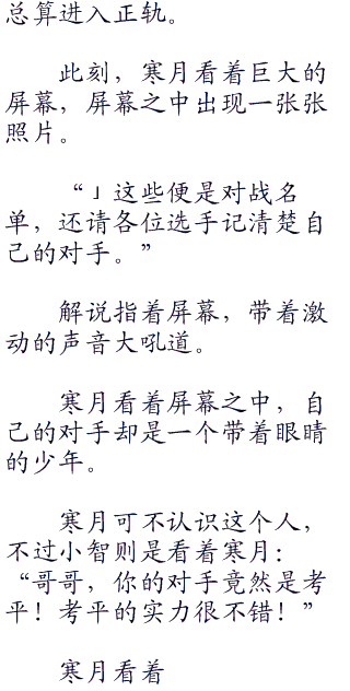 寒月带着丝丝玩味,目光凝视热火朝天的战场。十几个战场,不断的进行战斗,一千多人的参赛者,其中已经被淘汰了一半以上。