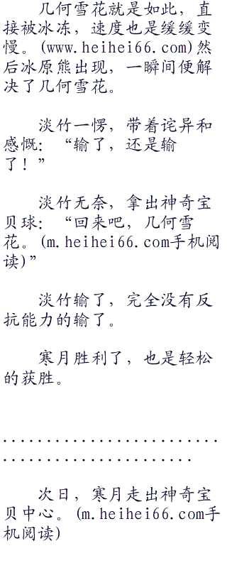 寒月的冰原熊,没有多少能力。紫色的冰块,却是带着一股冰冻身躯,减缓神奇宝贝速度的能力。暴风雪,急冻光线........任何冰系绝招,都是呈现紫色。这些绝招命中对方,对方的速度就会缓缓减慢,就算是冰系神奇宝贝也是一样。