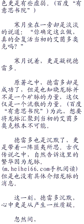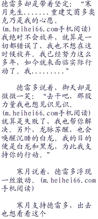 寒月微微一笑:“看来德雷多知道很多啊!不过你的身体有些虚弱,尤其是这头发的白色乃是不自然的白色,看来唤醒那个东西流逝不少生命吧!”