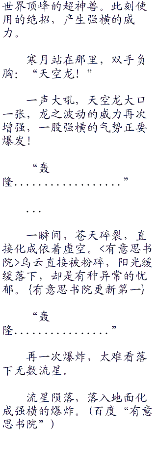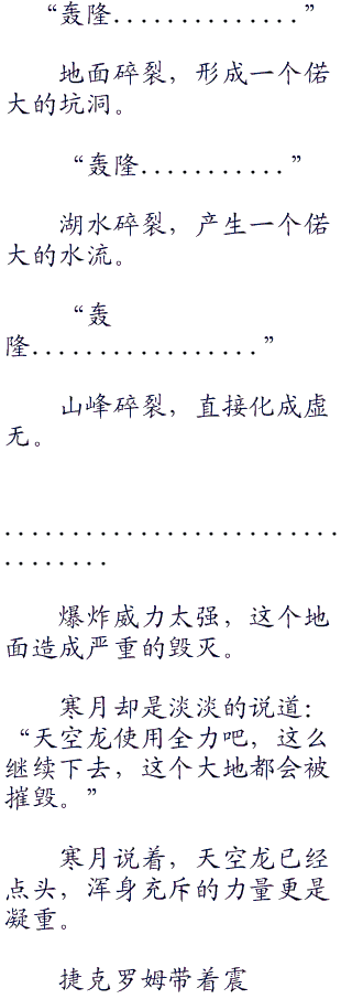 捷克罗姆痛苦的吼叫:“人类......让天空龙和我战斗。胜利了,我才会真正臣服你。两个战胜我,我也不会臣服!”