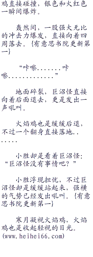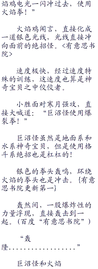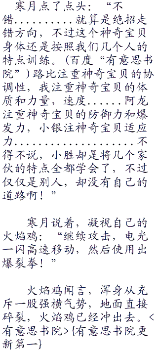 寒月微微一笑,却是淡淡的说道:“不错的冲浪绝招,不过仅仅如此可不够了。注重绝招的特性和运用,但是威力确实不可避免的降“零二零”低。火焰鸡使用喷射火焰,直接冲破这个海浪!”