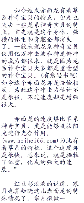 寒月很奇怪,赤面龙具备这么强大的力量,具备这么强大的防御力,为何体重却是如此的轻微。收服赤面龙之后,寒月甚至一只手将赤面龙举起来。这完全就是一个皮卡丘的重量。但是怎么看,也感觉不出这么体型巨大的赤面龙,体重竟然宛如一个小巧的皮卡丘。
