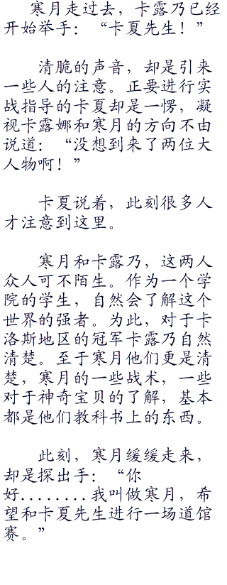 寒月牵着卡露乃,向着一旁的神奇宝贝中心走过来。