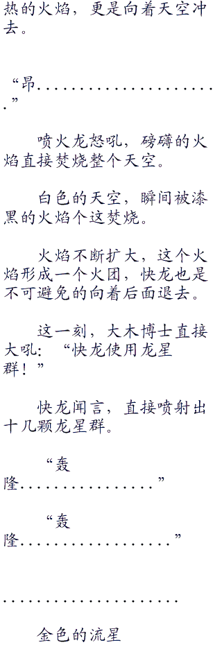 此刻,御天无言,不过却是扔出神奇宝贝球:“没办法,就由你出战吧!出来吧,喷火龙!”