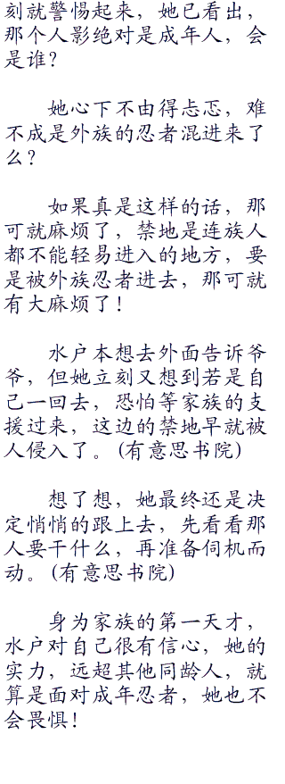 漩涡水户是家族第一天才,她不仅是族长的孙女,还是整个家族的新生代强者,这样的人才,家族又怎么舍得她在这么小的年纪就陨落呢?所以这次试炼的背后,家族出动了最大的力量去保障这些孩子们的安全,而暗中保护漩涡水户的,是家族中数一数二的高手,漩涡七海,是一名准族长级忍者。