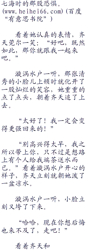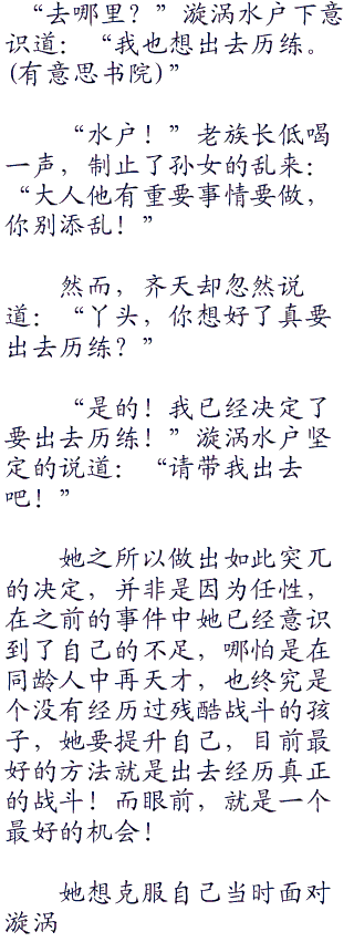 爷爷的教训顿时就让水户吓了一跳,她还从未见过爷爷用如此严肃的话语警告她,心里不由得委屈,但也只好点头答应:“我知道了,爷爷”