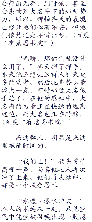 看着两人旁若无人的在拌嘴,那领头男子终于忍无可忍:“受死吧!水遁·水龙弹之术!”