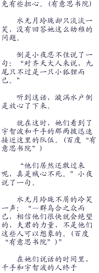 自从看到那只强大的九尾妖狐后,漩涡水户就有些担心齐天的安危起来,虽然齐天一路上表现出来的强大力量已经在她的心里打下了一个深刻的烙印,可九尾妖狐的强大,还是震慑住了她,让她不