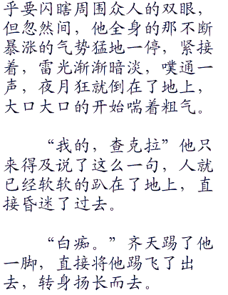 “没用的废物!”夜月狂手一甩,直接将他丢了出去,可怜那大汉直接就被摔晕了过去。