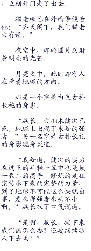 更有甚者,不仅开启了灵智,还拥有了能够说话的本领,这些猫的天赋更强,直接就组建了忍猫家族,开始直接参与到人类的活动当中去,有的成为人类的通灵兽,有的则是像这里的猫老板一样做人类的生意。