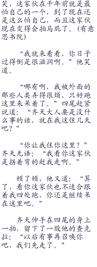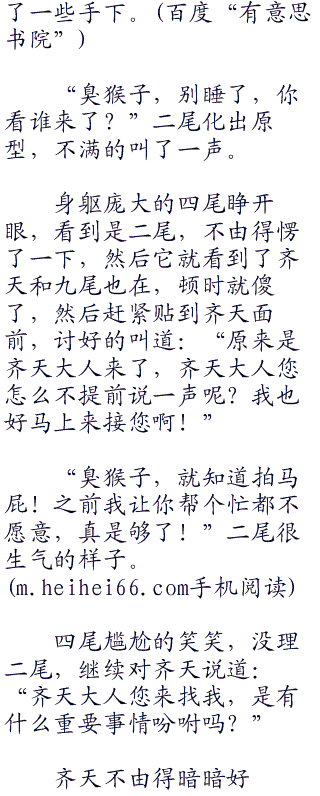 果然啊,跟着齐天就是爽啊,本来它收集到夜月一族要来抓它的消息时,它自己是很忌惮的,因为它根本没有把握对付夜月一族的强大雷遁和体术,以它的实力或许可以干死族长,但肯定干不过整个夜月一族,所以才要请齐天帮忙。