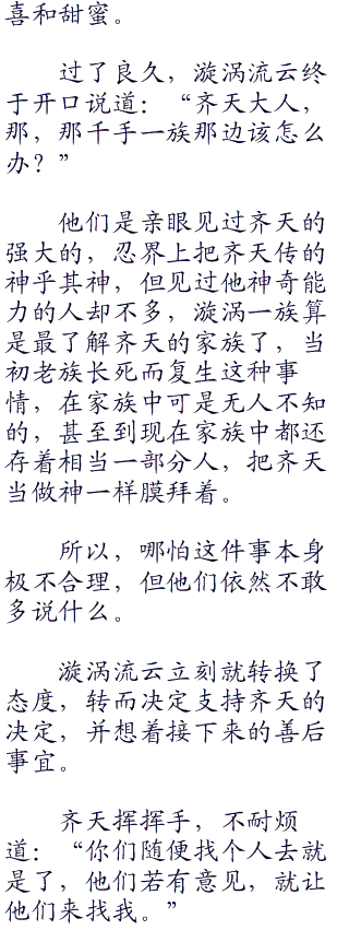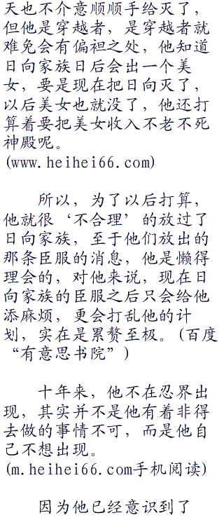 十年前,齐天从月球回来之后,得到了转生眼,开启了个人空间,当时他虽然因为精神力消耗过大而睡了过去,但很快就醒来,醒来后的他也知道了外界的各种言论,日向一族的表忠求饶自然也早就传入他的耳中,但当时他其实对此事根本就没有在意,日向一族算什么?在他眼里是可以随意踩死的蚂蚁,尽管日向家族三番两次的找他麻烦,在外界的人眼中那是死定了,可对他来说,这并不算什么。