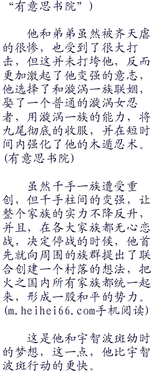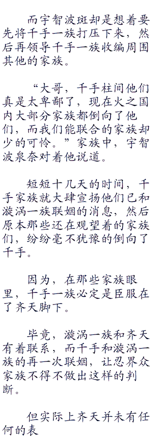 千手佛间听到这句话,顿时大喜,一喜之下,立刻就想和漩涡一族恢复联姻关系,这一次,他将姿态放到最低,对漩涡一族是百般讨好,最终漩涡流云答应了他的联姻,派出一个女忍者过去协助他们。