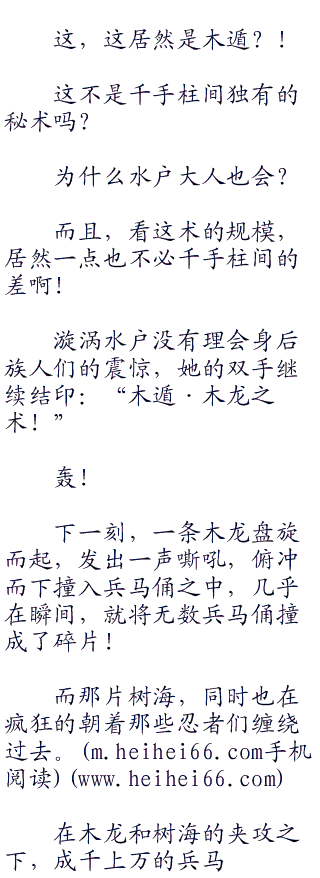 爆炸声四起,所有忍术不偏不倚落在那些兵马俑的身上,但效果却并不理想,兵马俑坚.硬无比,一般c级b级忍术竟然无法对它们造成太大的伤害,兵马俑们依然速度不减,朝着他们推进而来。