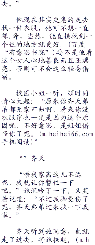 “啊,不,不好意思,他是我的病人呢。”女人回答道:“你看他什么都不穿的在大街上,就应该知道他有病了呢。”作为一名医生,她的相当的有自觉的,而且这种医生的自觉似乎还有点过头的感觉。