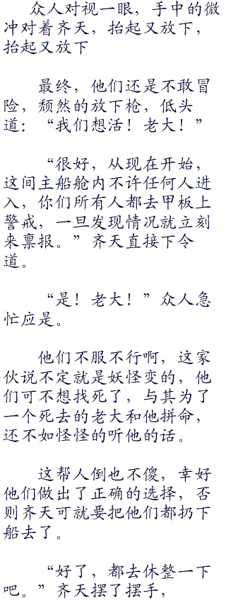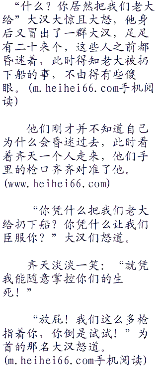 齐天站了出来,摆了摆手示意大家不必担心,他朝着门口的大汉走去,缓缓说道:“你们老大已经被我扔下海里喂鱼了,你们现在只有两个选择,一,臣服于我,二,下去陪你们老大!”