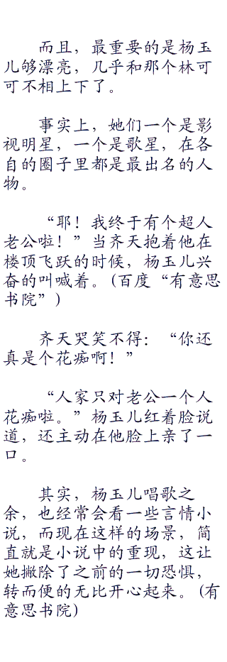 干死尸王后,齐天身子一跃,跳上了楼顶,在楼顶上,那位玉女歌星杨玉儿已经醒了过来,她看到齐天出现,她急忙就扑了过去。