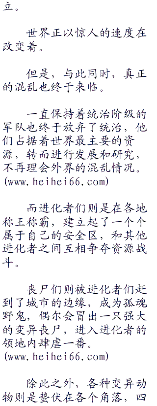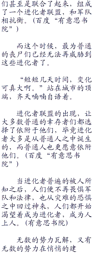渐渐的,城市之中涌现出了一个个由进化者组成的小队,这些小队不用惧怕丧尸的威胁,他们开始四处去寻找和掠夺一切有用的资源,甚至是有些直接占领了某一片区域,开始占地为王。