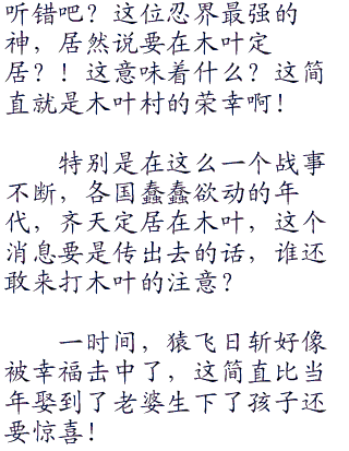 “不行,我得去见见他!”在原地转了好几圈后,猿飞终于下定了一个决心。