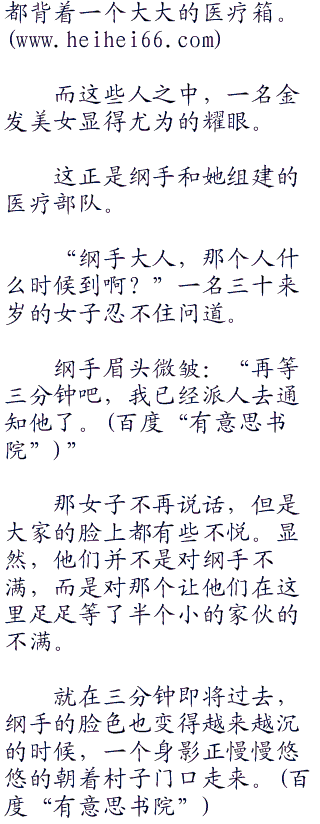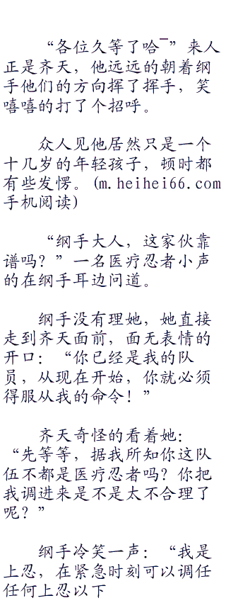整个队伍共有二三十人,平时作为医疗班呆在木叶的医院工作,一旦发生任务或者战事,就会被派遣出去执行任务。