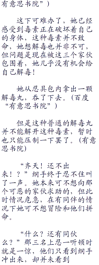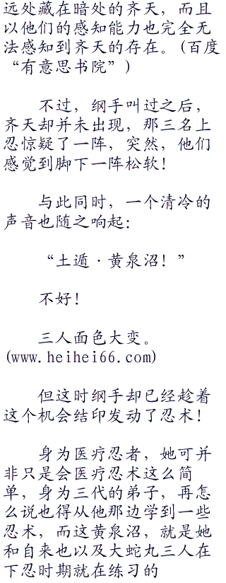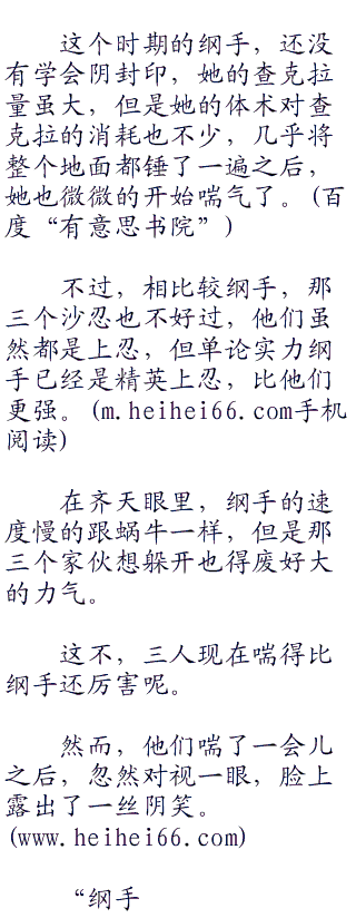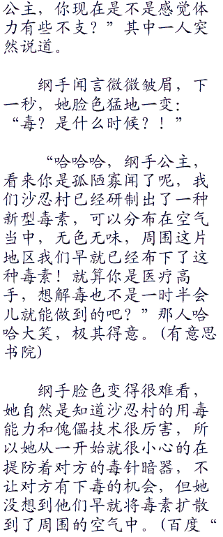 “果然是纲手!”而这时,那三名沙忍还没意识到自己已经被纲手个记恨上了,其中一名中年忍者冷笑道:“纲手公主的力气果然很大,但我们可不会和你比力气!我们要对付你大可用其他办法!”