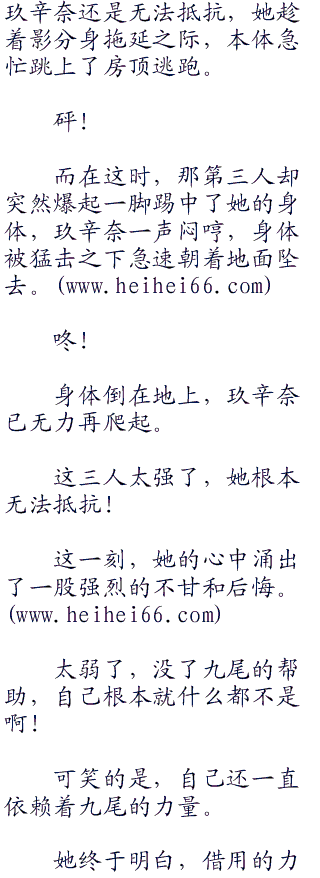 玖辛奈只得狼狈的一闪,堪堪避开了这一击,但下一刻其他两人却是已经行动,直接闪身出现在她的身后,双手一抓,便将她的两条手臂给抓在了手里。