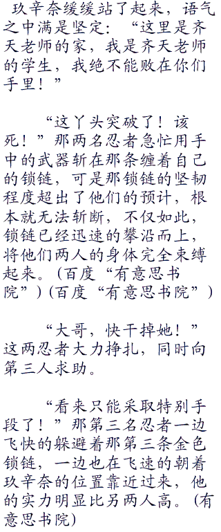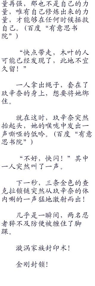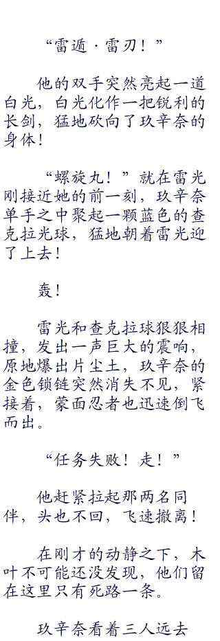 玖辛奈一惊,这是她唯一能够运用自如的风遁忍术,居然被这人一刀就破了,对方的实力绝对是在中忍以上,甚至可能是上忍。