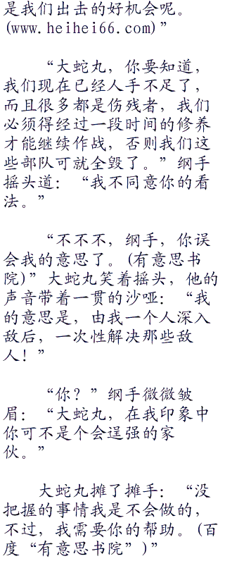 大蛇丸倒是没有在意纲手的那份卷轴,他看着纲手淡淡笑道:“纲手,前线的战事已经告一段落,我们现在双方都在整合修养,等待支援,不过我认为现在正