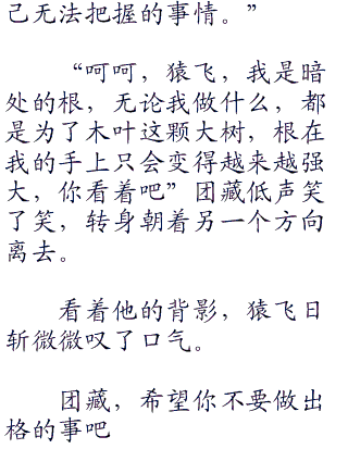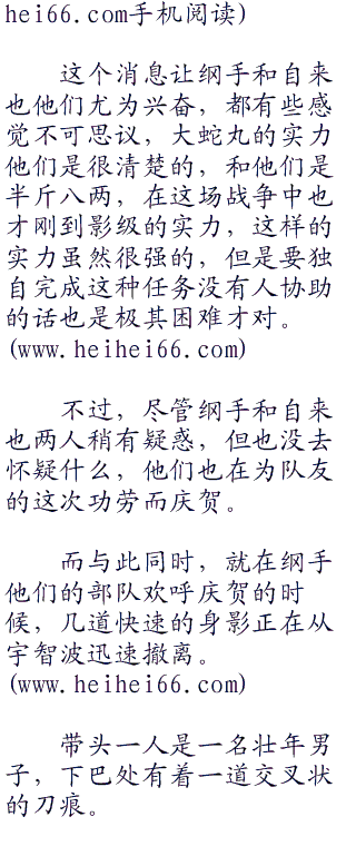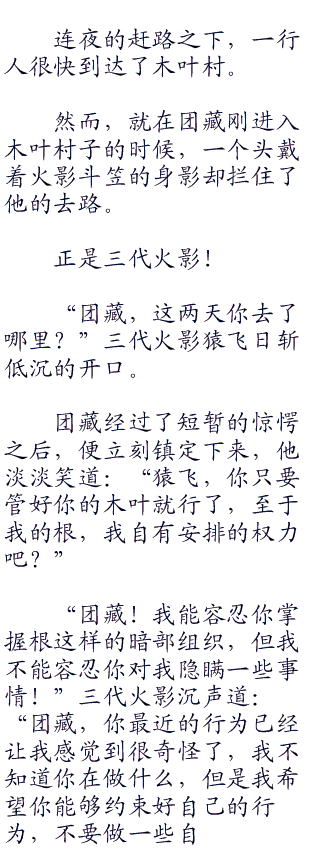 他们三人身上都各自带了些伤,回到基地,纲手用医疗忍术帮两位队友治疗了一番,然后就回到了自己的营帐。