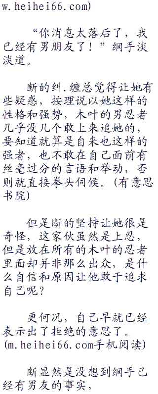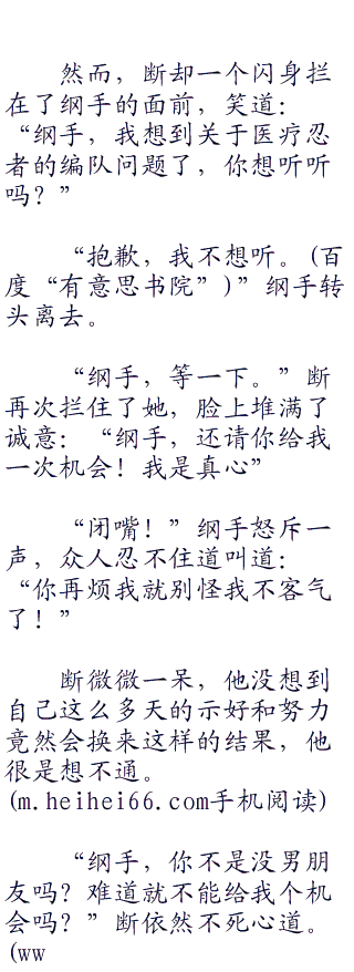 因为她突然发现有一个叫断的上忍竟然频频向她示好,在几次会议上不仅次次赞成她的提议,而且在会议结束后还拉着她要向她提供一些意见什么的。