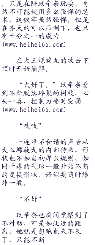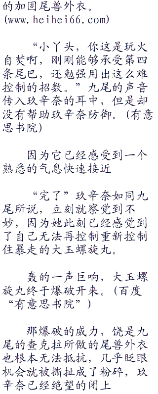 玖辛奈站在一旁,有着尾兽外衣的保护,很容易的抵挡了为数不多尖刺的突击。