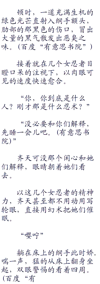 而在她周围,还有几个女忍者正在使用医疗忍术不断的治疗,可是那个伤口却一直都没有愈合的迹象。