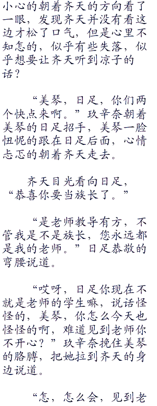 齐天好笑的看着在他身边蹦蹦跳跳的小南忍不住笑出声来,谁能想到,那个冷漠的纸之天使会露出如此小女孩的一面?