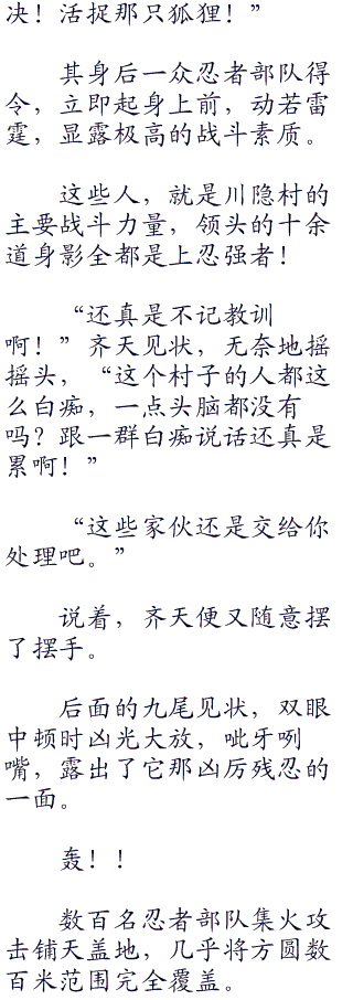 只是九尾的动作太快,这些人根本来不及救援,只能在赶来的路上望着一名名忍者被九尾碾杀的画面,尤其是最后拍击那几名上忍的一幕,让为首的老者愤怒得快要吐血。