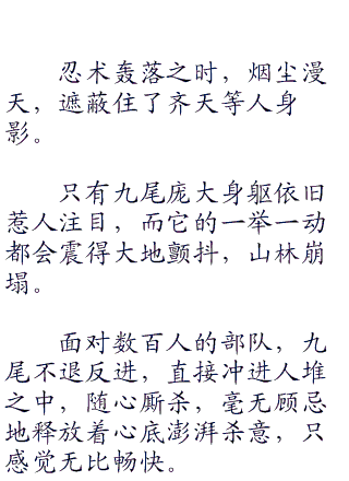 场中还能有些许抵抗力量的就是那几名上忍,他们凭借超越中忍的体术能力避过了九尾数次拍击,这也惹得九尾有些愤怒恼火,身后长长尾巴运使扫荡过来。