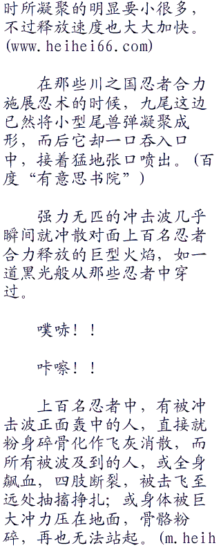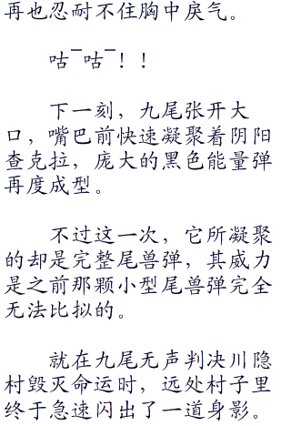 密密麻麻的蝌蚪般文字从卷轴中延伸出来,趁着九尾正对付周围忍者部队的时候,迅速爬上后者身体。