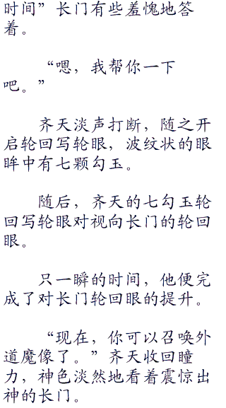 虽说长门的轮回眼本来就好好的在那里长着,但齐天知道这双轮回眼并不是长门自己所开启的,如果日后没有大的变故,长门进阶掌握更高级别的轮回眼能力需要很长一段时间的修行。