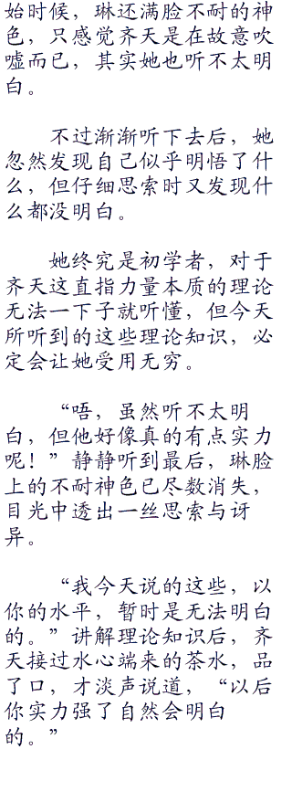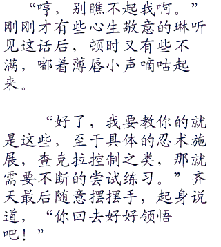 其实齐天对琳并没有什么反感态度,只是单纯觉得教导人很麻烦而已,何况对方还是个初学者,那就更麻烦了。