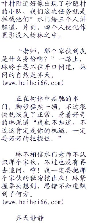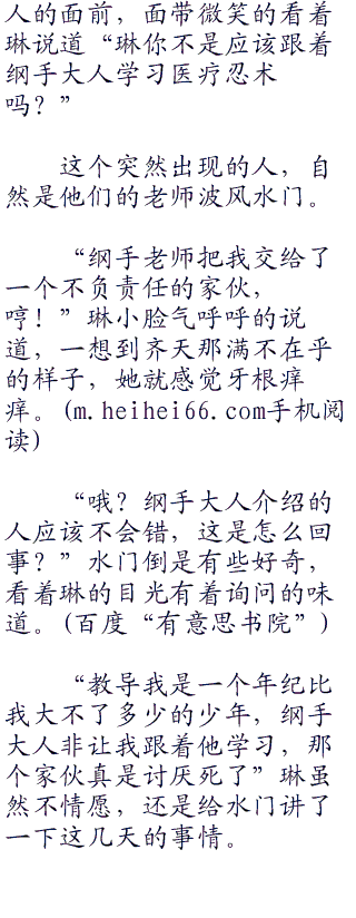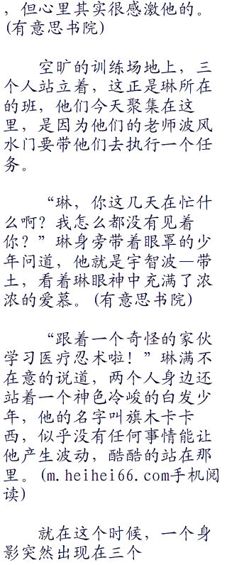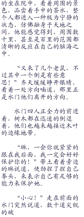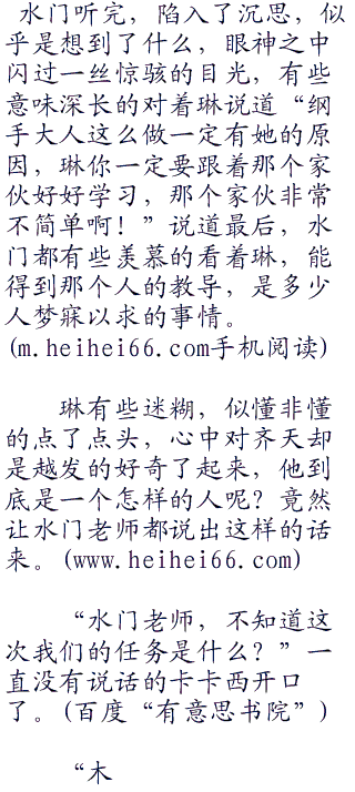 齐天要是听到琳的话,一定会哭笑不得的,这般教导一直持续了四五天,而琳所在的班也接到了任务,这齐天的教导也暂停下来。