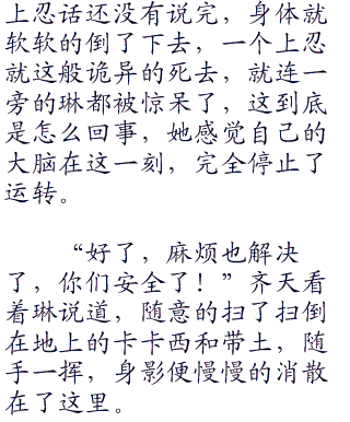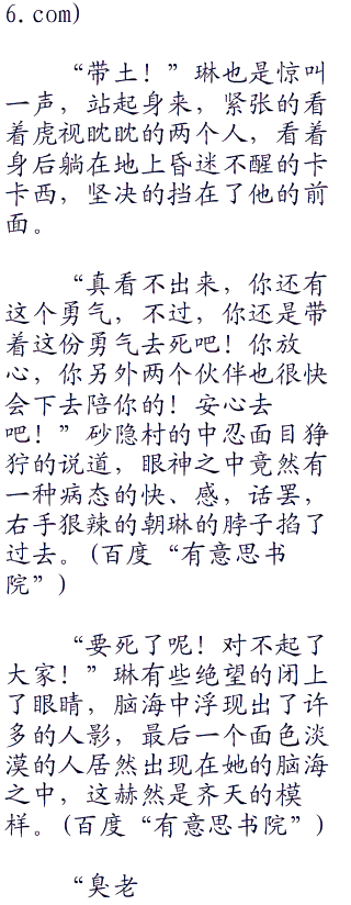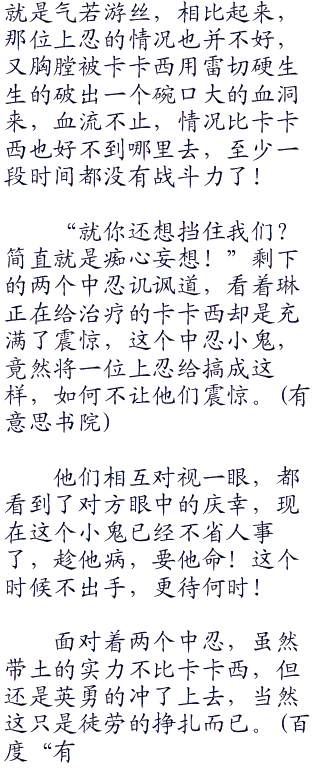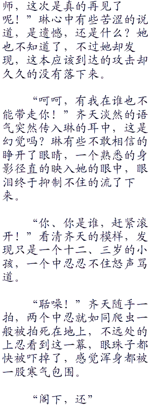 “去死吧小鬼!”背后突然一声暴喝,冰冷锋利的气息从背后传出,显然,刚才的那个上忍只是一个替身术而已,背后这个才是真正的杀手锏。衅
