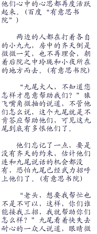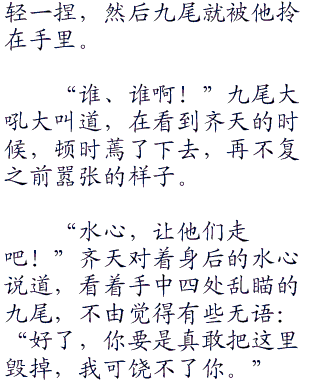 齐天耸了耸肩,对于九尾现在这个样子倒是没有多加理会,他知道九尾心中的怨气,不是这一两句话就能消除的!