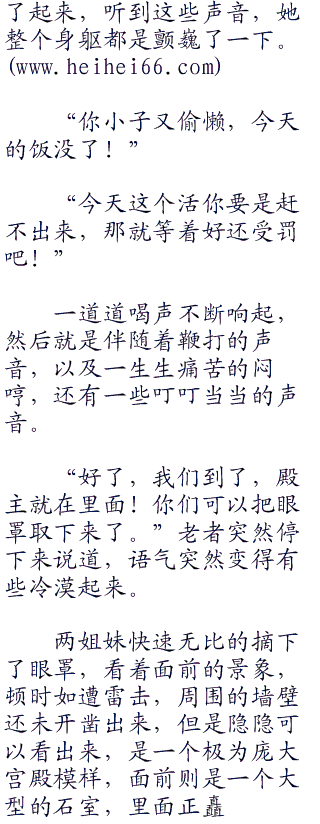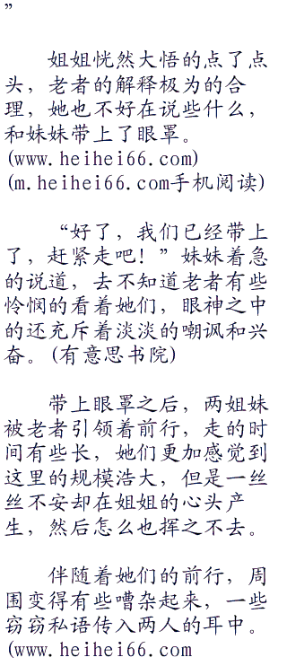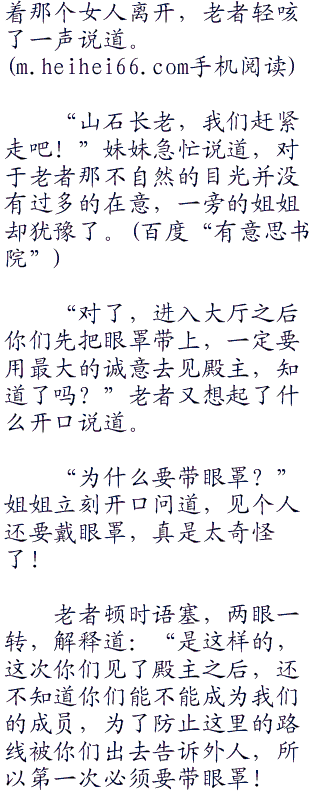 很快,老者便走了回来,递给了两姐妹两个眼罩说道“殿主大人已经同意了,这东西你们先拿着,等我们见完殿主,进行完入殿欢迎仪式之后,你们就正是成为我们的一员了!”